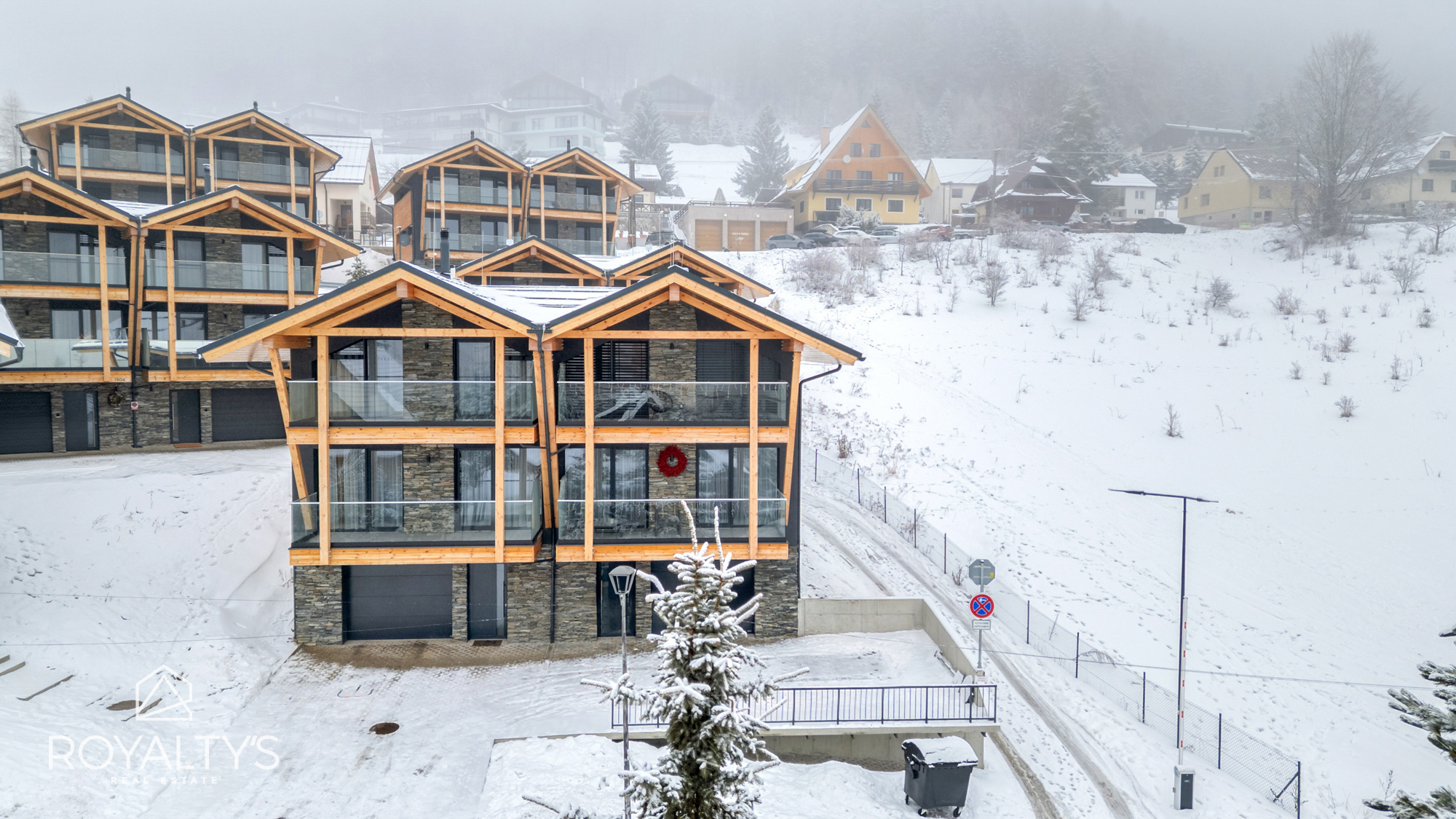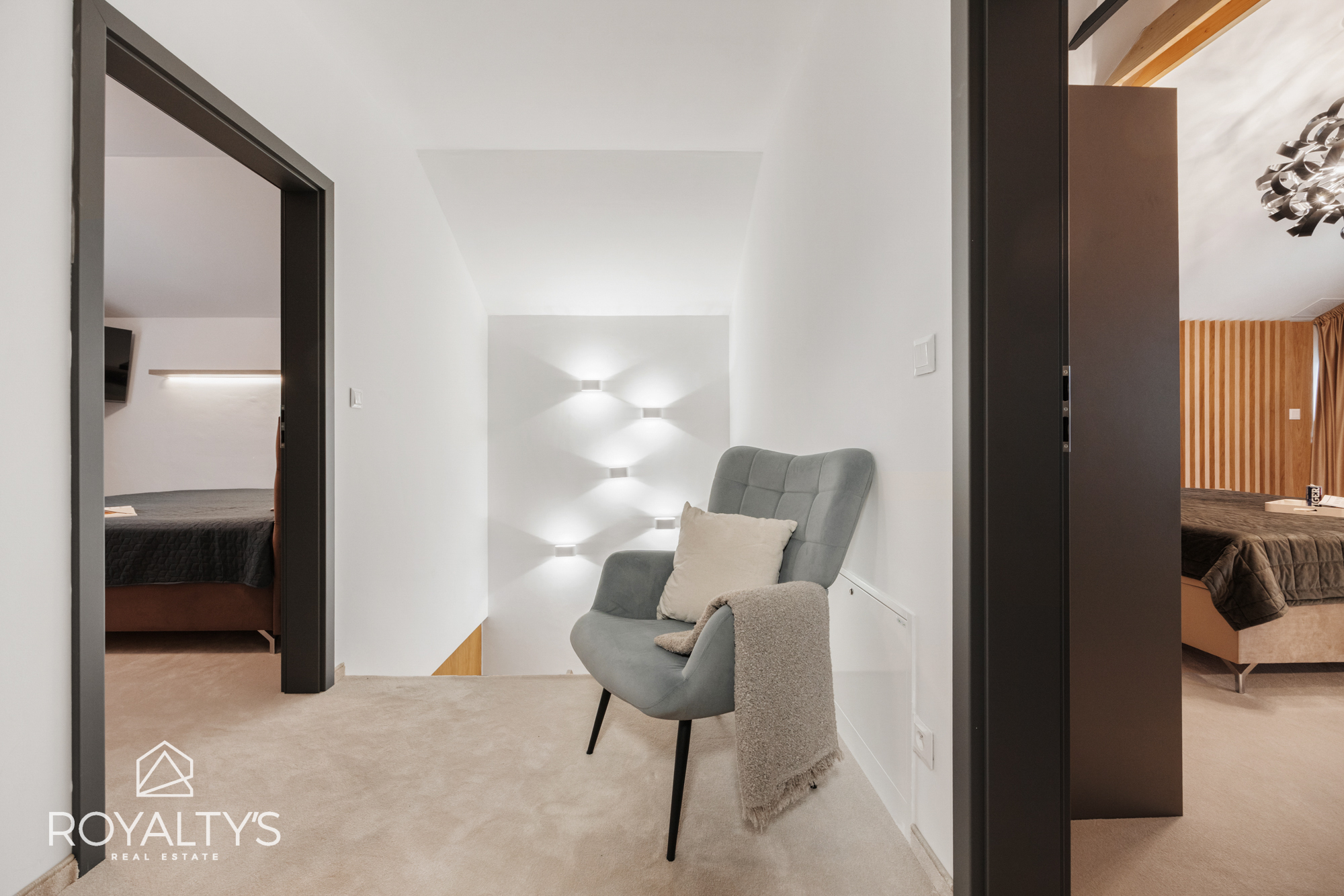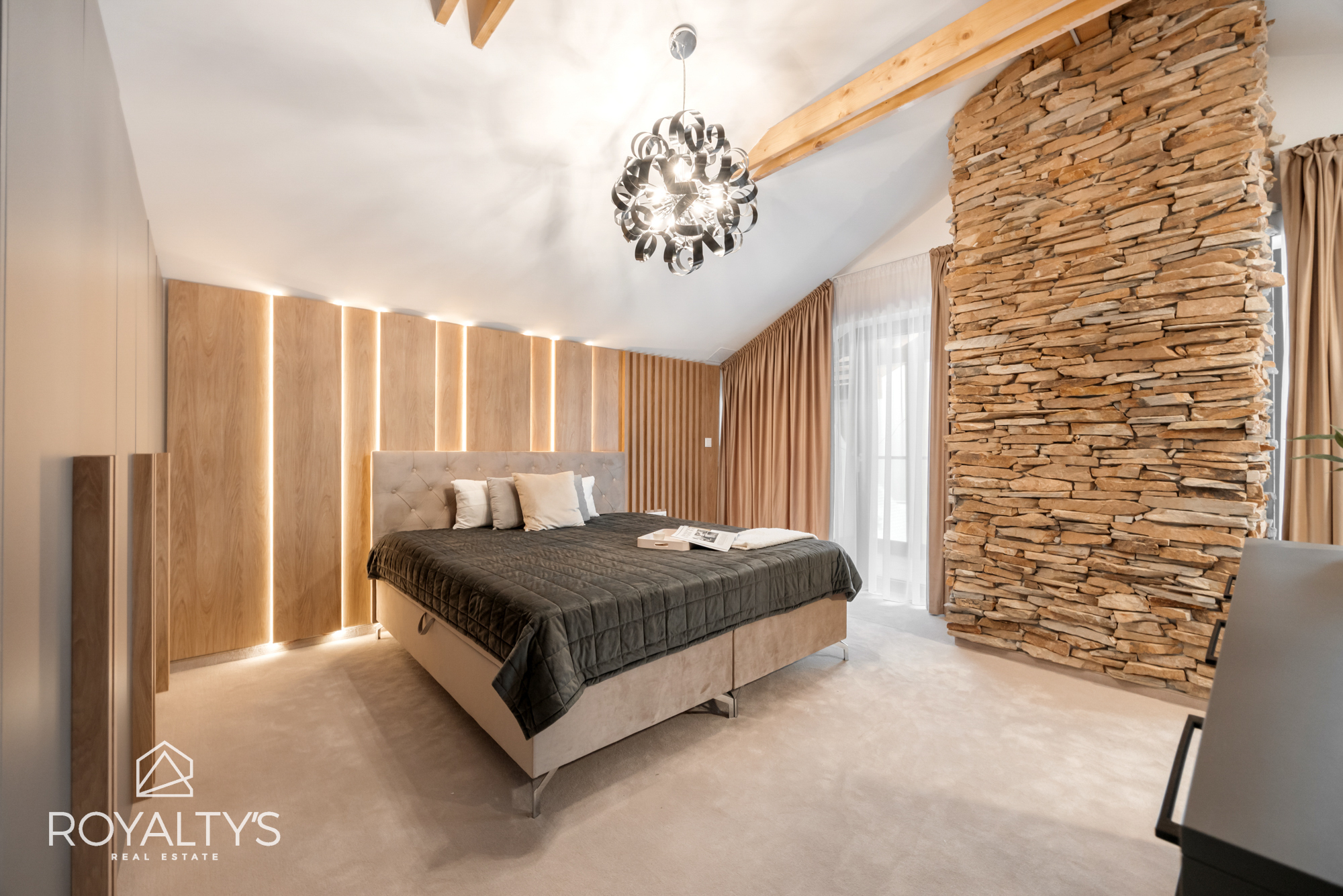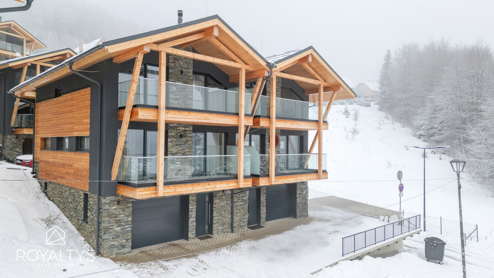 Za všetkými výhodami umiestnenia nehnuteľnosti nezaostáva ani jej samotné vybavenie pripravené na celoročné užívanie. 5 izieb, 4 kúpeľne a ďalšie miestnosti tvoria úžitkový priestor rozdelený na troch podlažiach. Dispozícia je dôkladne premyslená. Interiér je rozvrhnutý do dennej a nočnej časti a komunikuje s nádherným exteriérom. Prízemie predstavuje vstupná chodba s úložným priestorom, na ktorú nadväzuje vstup do garáže. Na tomto podlaží nájdete okrem technickej miestnosti s práčovňou aj kúpeľňu, WC a ďalšiu samostatnú miestnosť, ktorá prináša unikátny priestor pre rôzne účely využitia ako napríklad sauna či privátne fittness centrum. Drevené schodisko vás uvedie do dennej časti tohto štýlového chaletu. Jeho srdcom je vzdušná obývacia izba s krbom, kuchyňou na mieru, doplnená štýlovým jedálenským sedením, ponúkajúca výstup na jednu z terás 12 m². Denné podlažie dopĺňa útulná hosťovská izba a kúpeľňa so sprchovým kútom a toaletou. Nočnú časť na hornom podlaží predstavujú tri zariadené izby, z ktorých dve slúžia ako hosťovské/detské izby doplnené kúpeľňou s toaletou. Dizajnová hlavná spálňa, ktorej súčasťou je vysunutá kúpeľňa s podsvietenou mramorovou vaňou a sprchovým kútom ponúka okrem veľkorysého životného priestoru aj východ na druhú terasu 12 m².