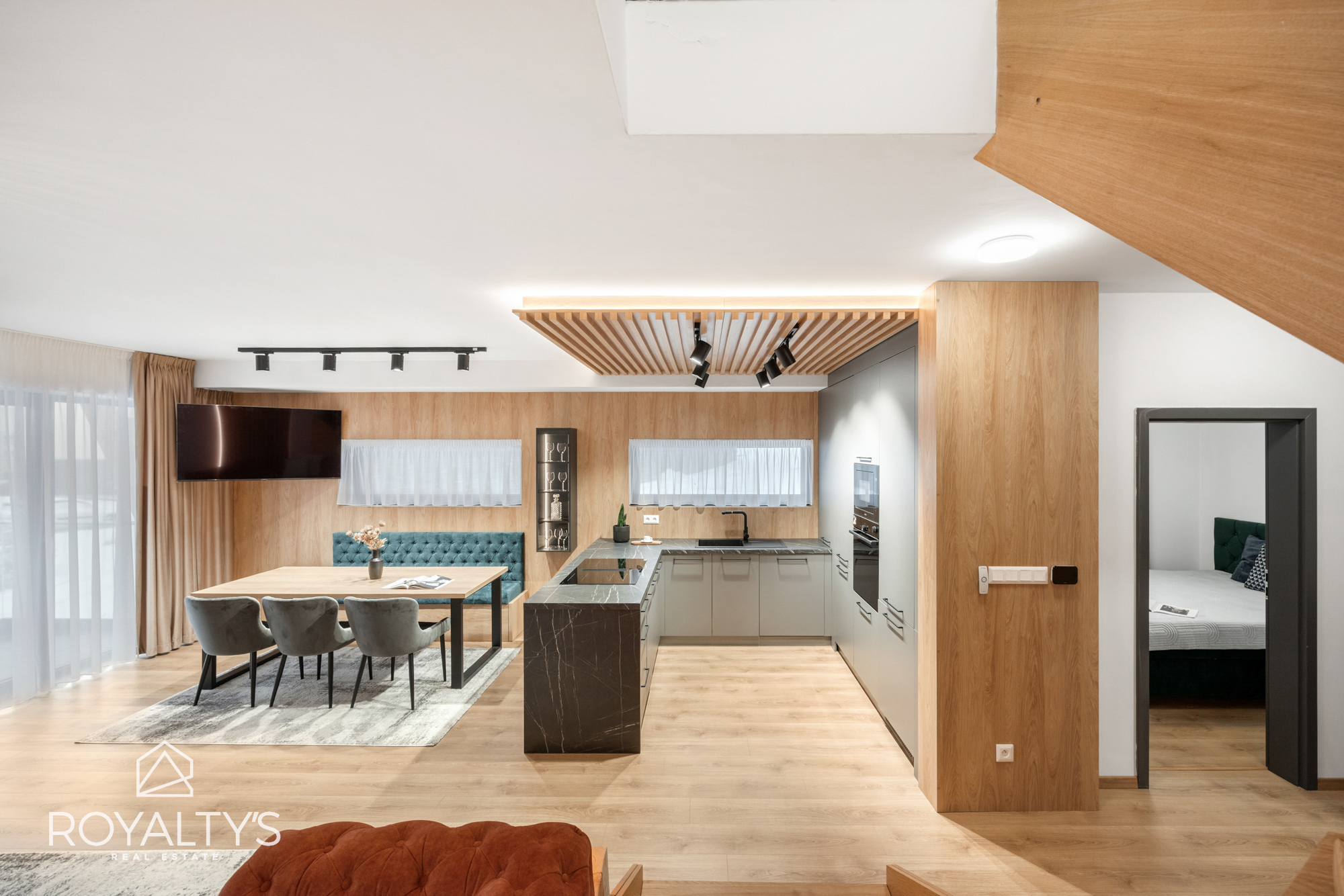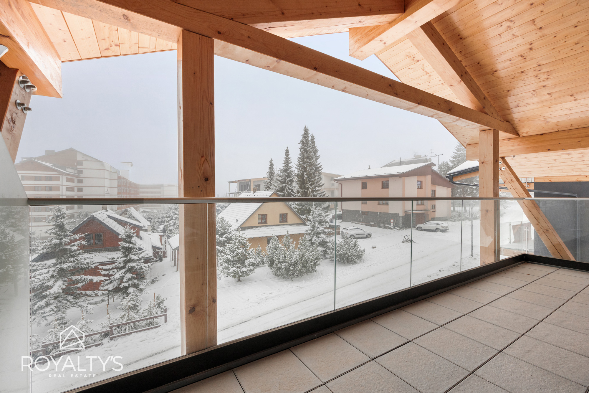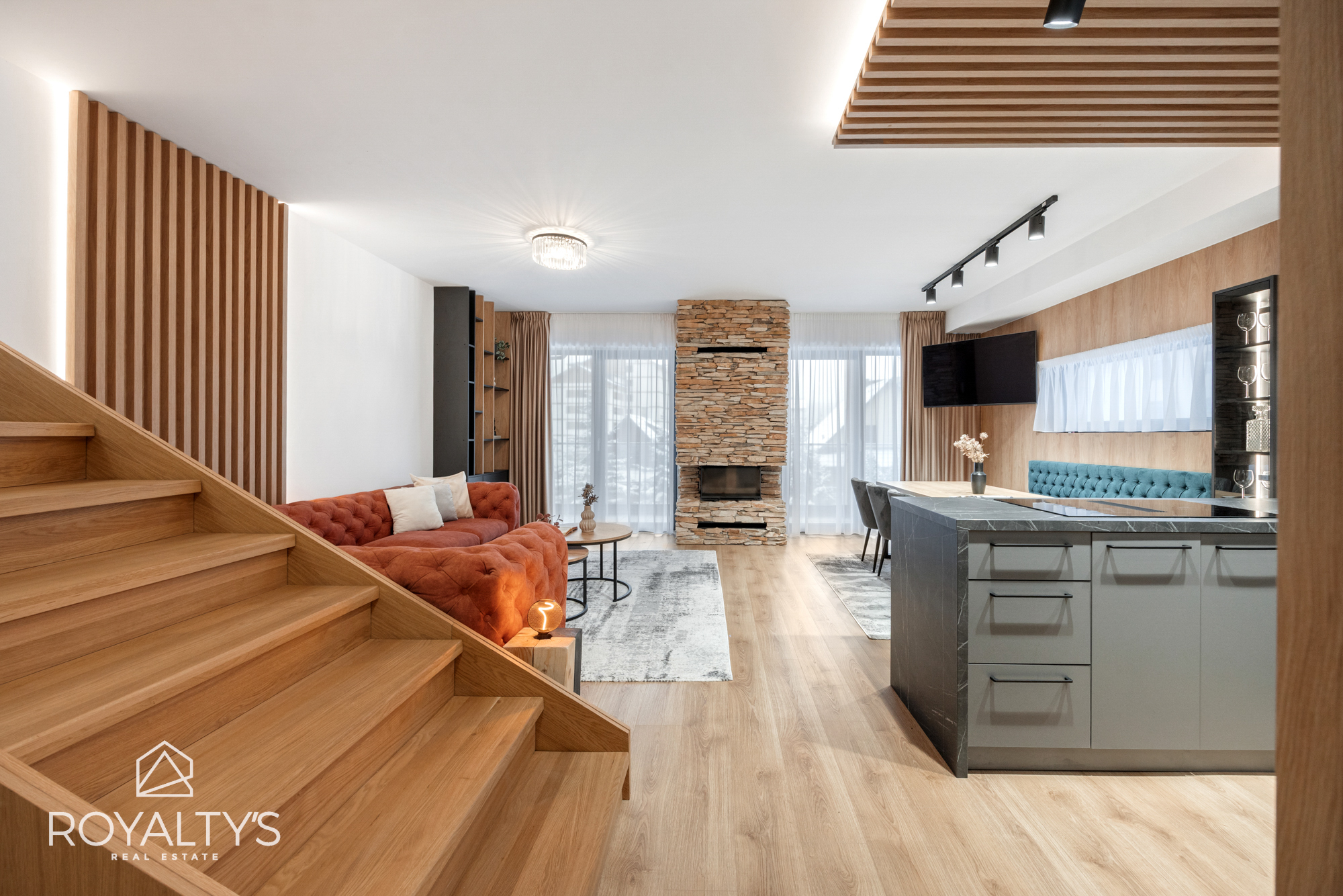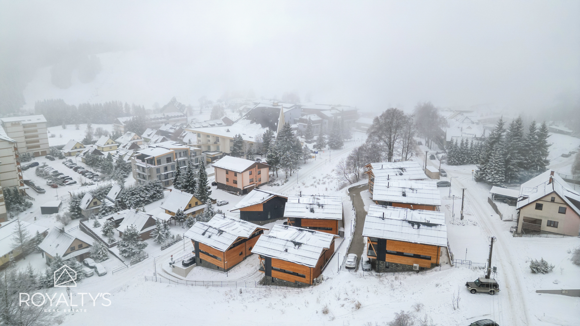 Za všetkými výhodami umiestnenia nehnuteľnosti nezaostáva ani jej samotné vybavenie pripravené na celoročné užívanie. 5 izieb, 4 kúpeľne a ďalšie miestnosti tvoria úžitkový priestor rozdelený na troch podlažiach. Dispozícia je dôkladne premyslená. Interiér je rozvrhnutý do dennej a nočnej časti a komunikuje s nádherným exteriérom. Prízemie predstavuje vstupná chodba s úložným priestorom, na ktorú nadväzuje vstup do garáže. Na tomto podlaží nájdete okrem technickej miestnosti s práčovňou aj kúpeľňu, WC a ďalšiu samostatnú miestnosť, ktorá prináša unikátny priestor pre rôzne účely využitia ako napríklad sauna či privátne fittness centrum. Drevené schodisko vás uvedie do dennej časti tohto štýlového chaletu. Jeho srdcom je vzdušná obývacia izba s krbom, kuchyňou na mieru, doplnená štýlovým jedálenským sedením, ponúkajúca výstup na jednu z terás 12 m². Denné podlažie dopĺňa útulná hosťovská izba a kúpeľňa so sprchovým kútom a toaletou. Nočnú časť na hornom podlaží predstavujú tri zariadené izby, z ktorých dve slúžia ako hosťovské/detské izby doplnené kúpeľňou s toaletou. Dizajnová hlavná spálňa, ktorej súčasťou je vysunutá kúpeľňa s podsvietenou mramorovou vaňou a sprchovým kútom ponúka okrem veľkorysého životného priestoru aj východ na druhú terasu 12 m².