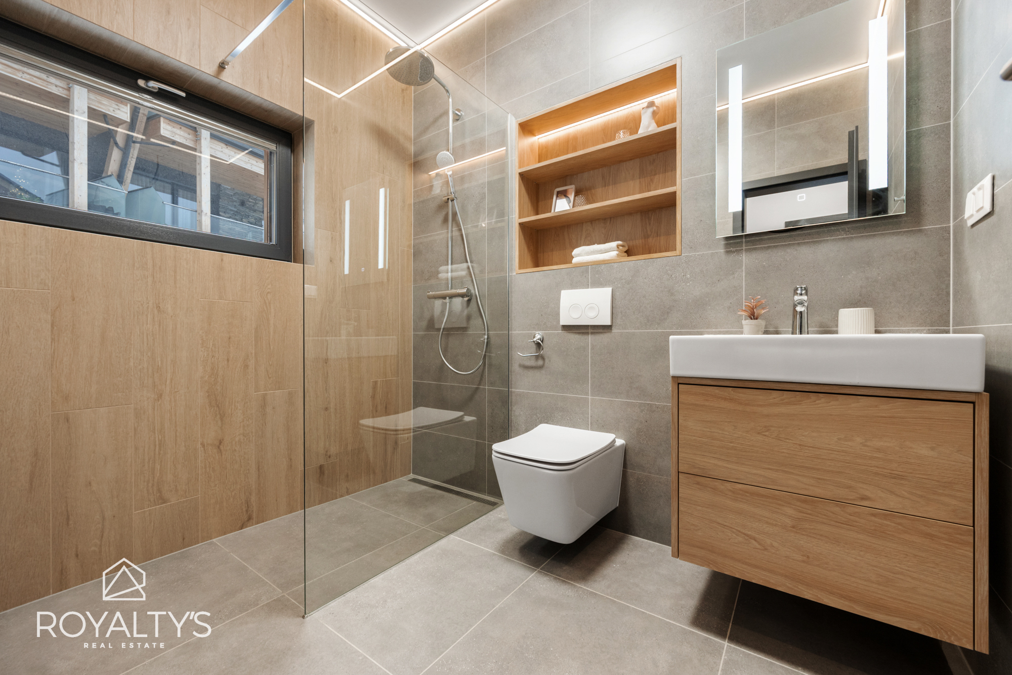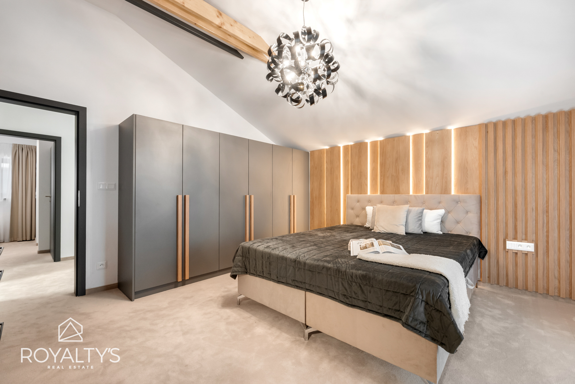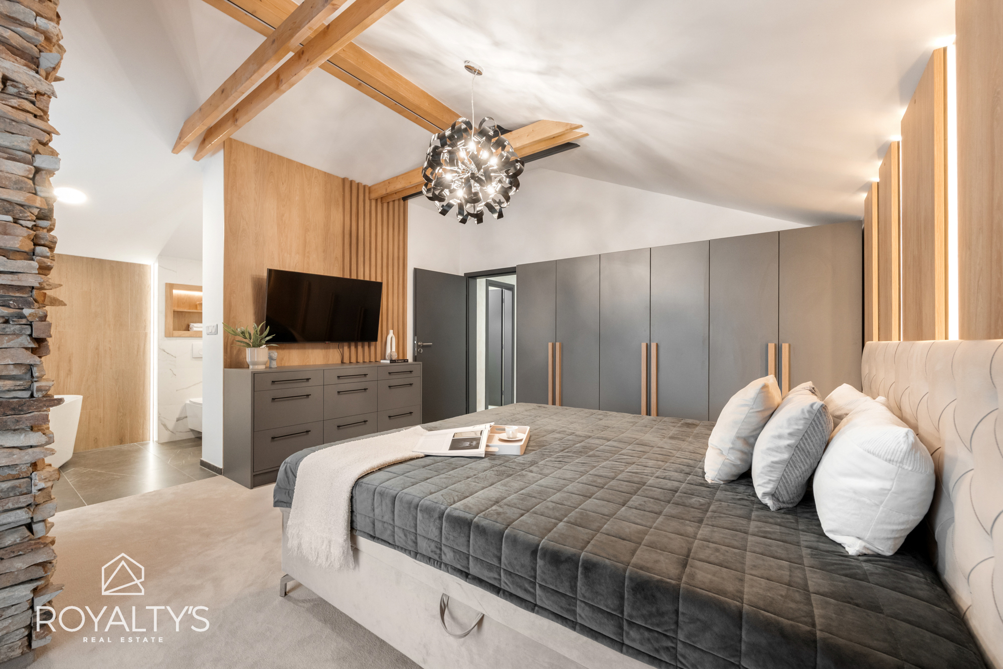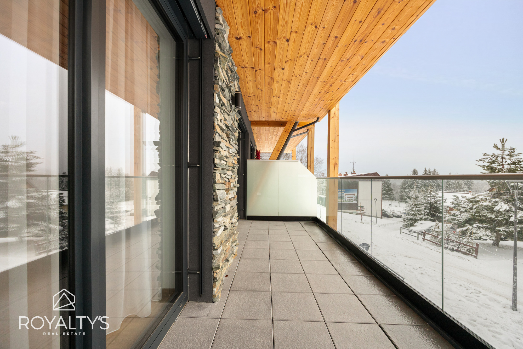 Za všetkými výhodami umiestnenia nehnuteľnosti nezaostáva ani jej samotné vybavenie pripravené na celoročné užívanie. 5 izieb, 4 kúpeľne a ďalšie miestnosti tvoria úžitkový priestor rozdelený na troch podlažiach. Dispozícia je dôkladne premyslená. Interiér je rozvrhnutý do dennej a nočnej časti a komunikuje s nádherným exteriérom. Prízemie predstavuje vstupná chodba s úložným priestorom, na ktorú nadväzuje vstup do garáže. Na tomto podlaží nájdete okrem technickej miestnosti s práčovňou aj kúpeľňu, WC a ďalšiu samostatnú miestnosť, ktorá prináša unikátny priestor pre rôzne účely využitia ako napríklad sauna či privátne fittness centrum. Drevené schodisko vás uvedie do dennej časti tohto štýlového chaletu. Jeho srdcom je vzdušná obývacia izba s krbom, kuchyňou na mieru, doplnená štýlovým jedálenským sedením, ponúkajúca výstup na jednu z terás 12 m². Denné podlažie dopĺňa útulná hosťovská izba a kúpeľňa so sprchovým kútom a toaletou. Nočnú časť na hornom podlaží predstavujú tri zariadené izby, z ktorých dve slúžia ako hosťovské/detské izby doplnené kúpeľňou s toaletou. Dizajnová hlavná spálňa, ktorej súčasťou je vysunutá kúpeľňa s podsvietenou mramorovou vaňou a sprchovým kútom ponúka okrem veľkorysého životného priestoru aj východ na druhú terasu 12 m².