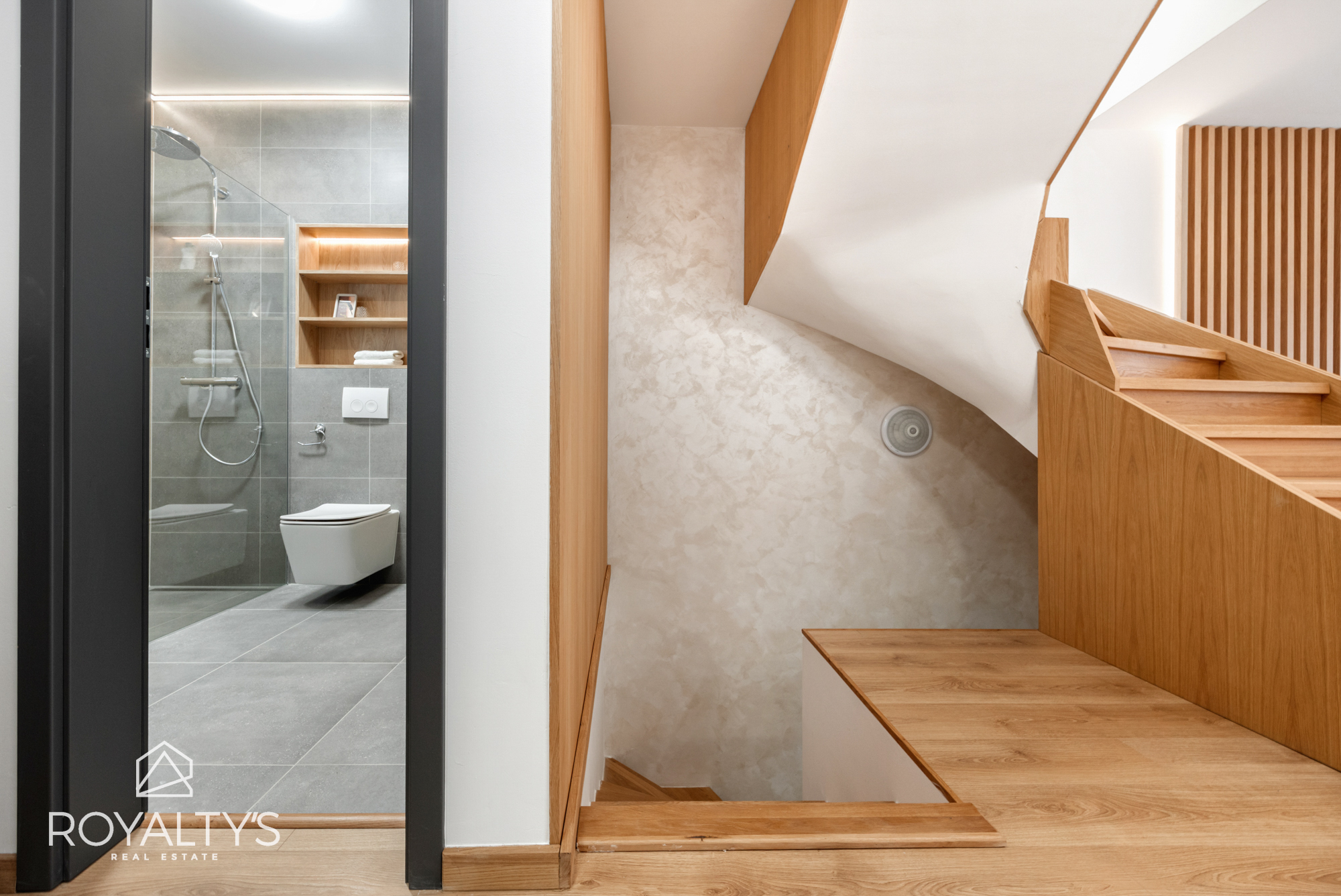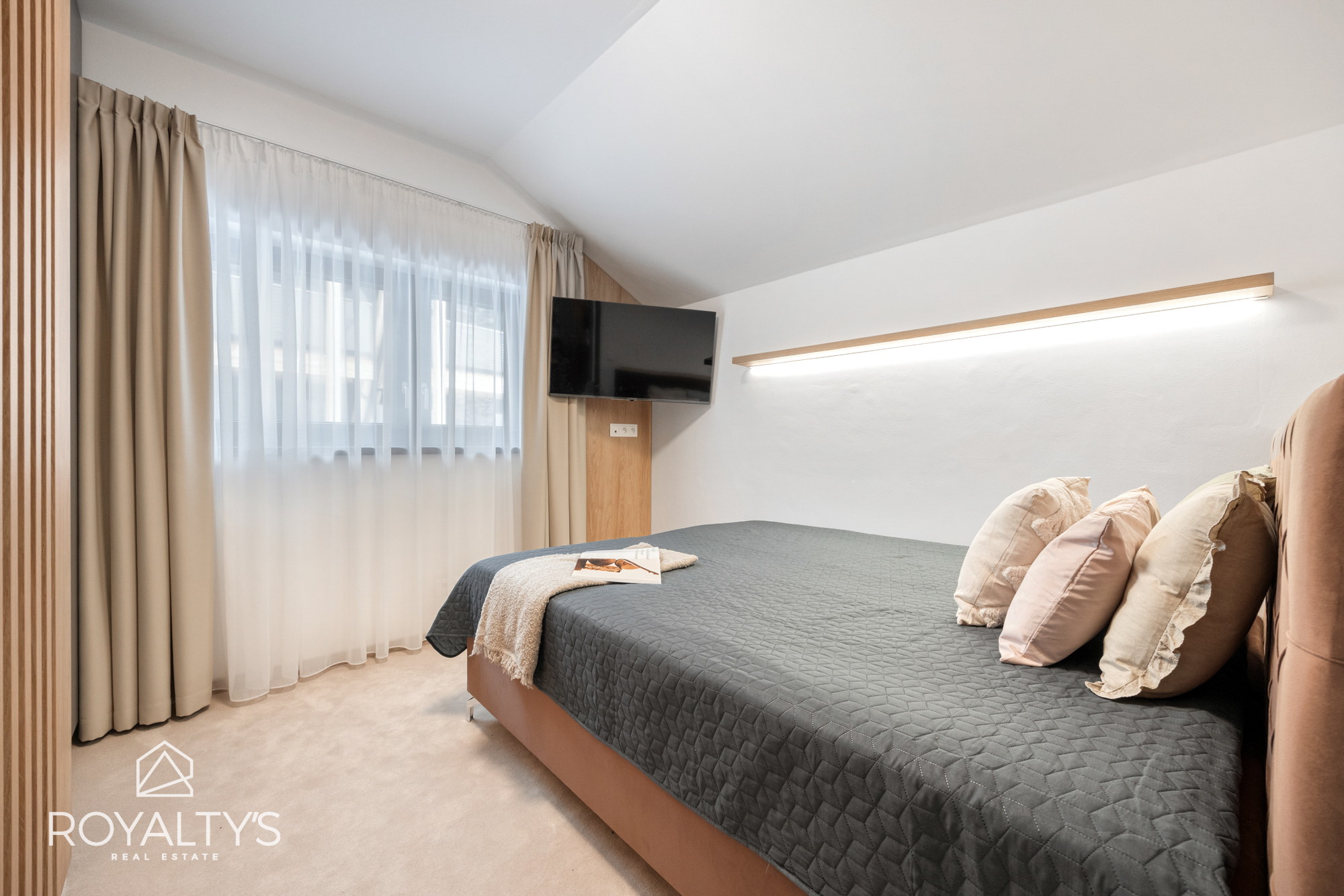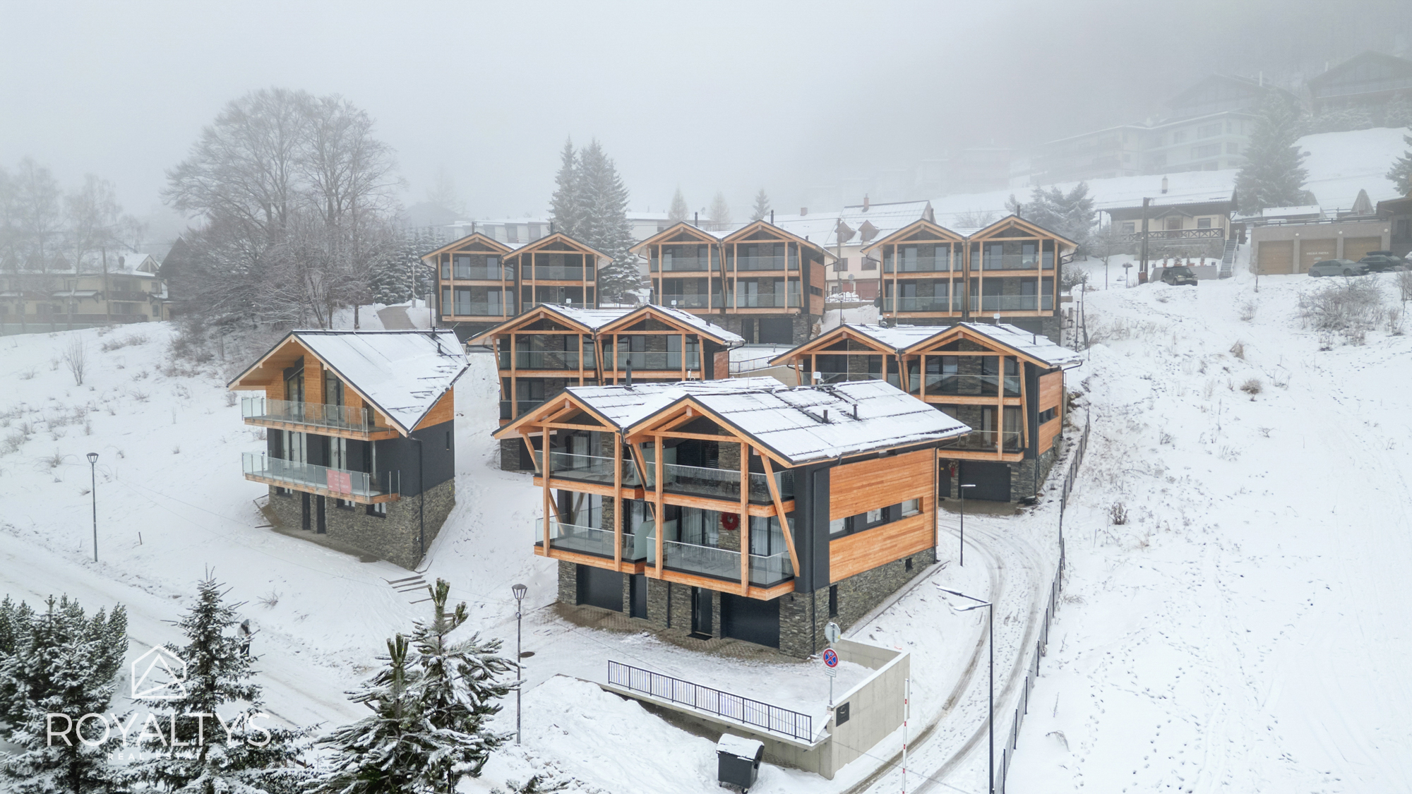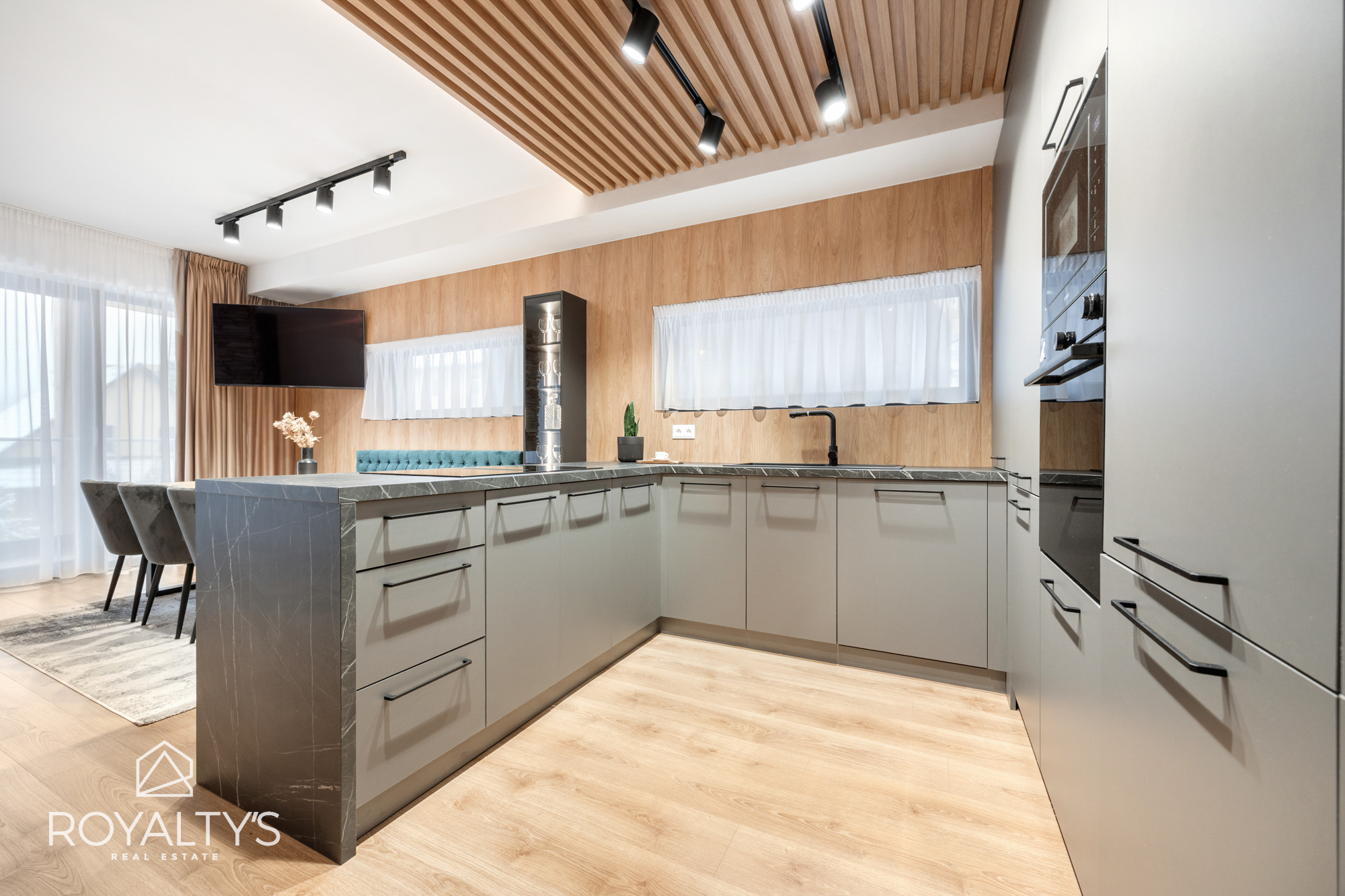 Za všetkými výhodami umiestnenia nehnuteľnosti nezaostáva ani jej samotné vybavenie pripravené na celoročné užívanie. 5 izieb, 4 kúpeľne a ďalšie miestnosti tvoria úžitkový priestor rozdelený na troch podlažiach. Dispozícia je dôkladne premyslená. Interiér je rozvrhnutý do dennej a nočnej časti a komunikuje s nádherným exteriérom. Prízemie predstavuje vstupná chodba s úložným priestorom, na ktorú nadväzuje vstup do garáže. Na tomto podlaží nájdete okrem technickej miestnosti s práčovňou aj kúpeľňu, WC a ďalšiu samostatnú miestnosť, ktorá prináša unikátny priestor pre rôzne účely využitia ako napríklad sauna či privátne fittness centrum. Drevené schodisko vás uvedie do dennej časti tohto štýlového chaletu. Jeho srdcom je vzdušná obývacia izba s krbom, kuchyňou na mieru, doplnená štýlovým jedálenským sedením, ponúkajúca výstup na jednu z terás 12 m². Denné podlažie dopĺňa útulná hosťovská izba a kúpeľňa so sprchovým kútom a toaletou. Nočnú časť na hornom podlaží predstavujú tri zariadené izby, z ktorých dve slúžia ako hosťovské/detské izby doplnené kúpeľňou s toaletou. Dizajnová hlavná spálňa, ktorej súčasťou je vysunutá kúpeľňa s podsvietenou mramorovou vaňou a sprchovým kútom ponúka okrem veľkorysého životného priestoru aj východ na druhú terasu 12 m².