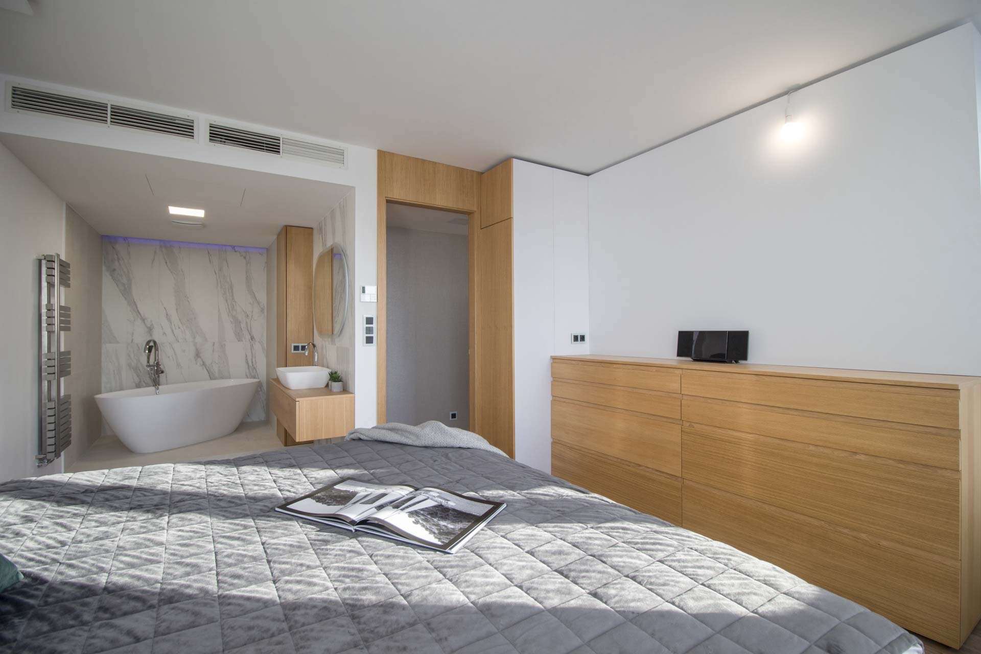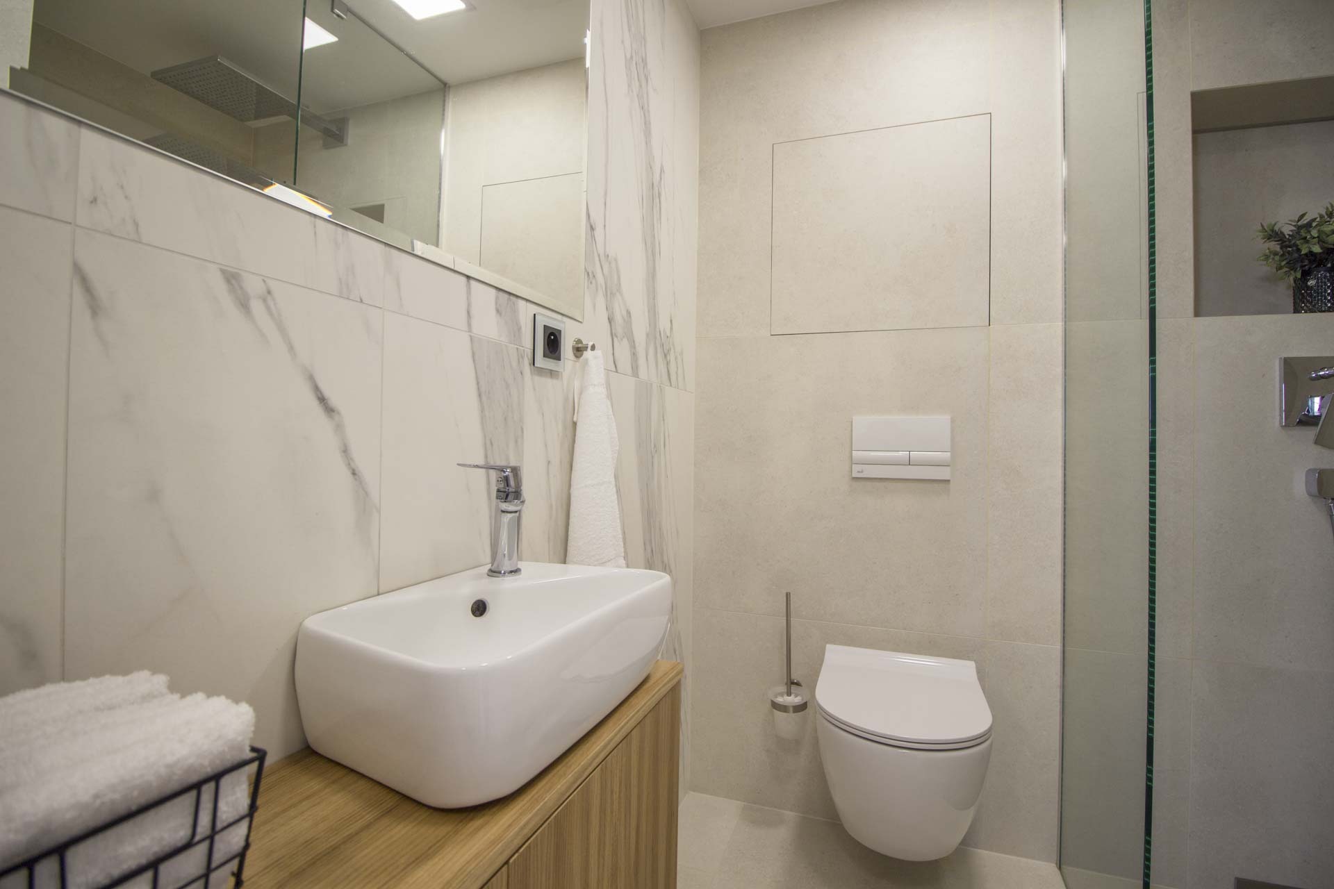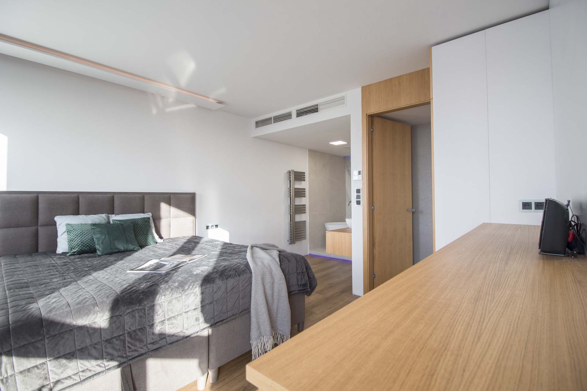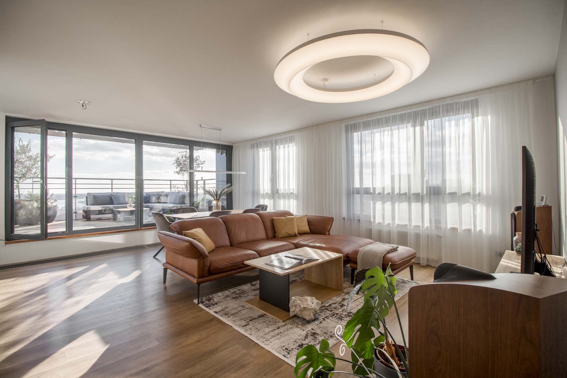 Novostavba pôvodne 4-izbového bytu s veľkorysou rozlohou 90 m² je dispozične orientovaná na juhozápad. Dominantou je vyslovene nádherná priestranná obývacia izba s jedálňou a kuchyňou na mieru, ktoré vás zaručene vytiahnu povečerať na terasu s panoramatickým výhľadom. Kožená polohovateľná sedacia súprava nemeckej značky W. Shillig, king size bed 200 x 200 zn. Hypnose, nábytok na mieru, podsvietené kúpeľne či vaňa z liateho mramoru Roca Ariane. To všetko je len začiatok. Veľmi vkusne zvolené materiály najvyššej kvality puncujú každý kút od kuchyne až po kúpeľňu. To ocení každý, kto si potrpí na luxus a kvalitu. Vzdušný a preslnený dojem zabezpečujú veľkoformátové hliníkové okná. Punc luxusu vyzdvihujú podsvietené podhľady, ktoré v noci prinášajú úplne iný zážitok. Raritné sú svojimi rozmermi aj veľkoformátové obklady a dlažby. Vo vybavení bytu kolaudovaného v 2018 nechýba podlahové kúrenie, klimatizácia, exteriérové žalúzie a systém inteligentnej domácnosti. Zdôraznený je aj detail akým je statika terasy pripravená na osadenie jacuzzi. Na terase 25 m² nájdete okrem pohodlnej exteriérovej sedacej súpravy aj rôzne kvety, bylinky, či stromy ako oliva, citrónovník a figa. Dispozične byt pozostáva zo vstupnej chodby vybavenej šatníkovou skriňou, kúpeľne s toaletou a sprchovým kútom, veľkým presvetleným obývacím priestorom s kuchyňou, jedálňou, oddeleným pracovným kútom a vstupom na slnečnú terasu. Nočnú časť tvorí priestranná spálňa, ktorej súčasťou je vysunutá kúpeľňa s dizajnovou podsvietenou mramorovou vaňou a umývadlom. Netreba zabudnúť na rozľahlý walk-in šatník pozostávajúci zo 14-tich skríň a komody. Nehnuteľnosť je určená pre náročného klienta, ktorému ponúkne výbornú dostupnosť a výnimočné prvky.